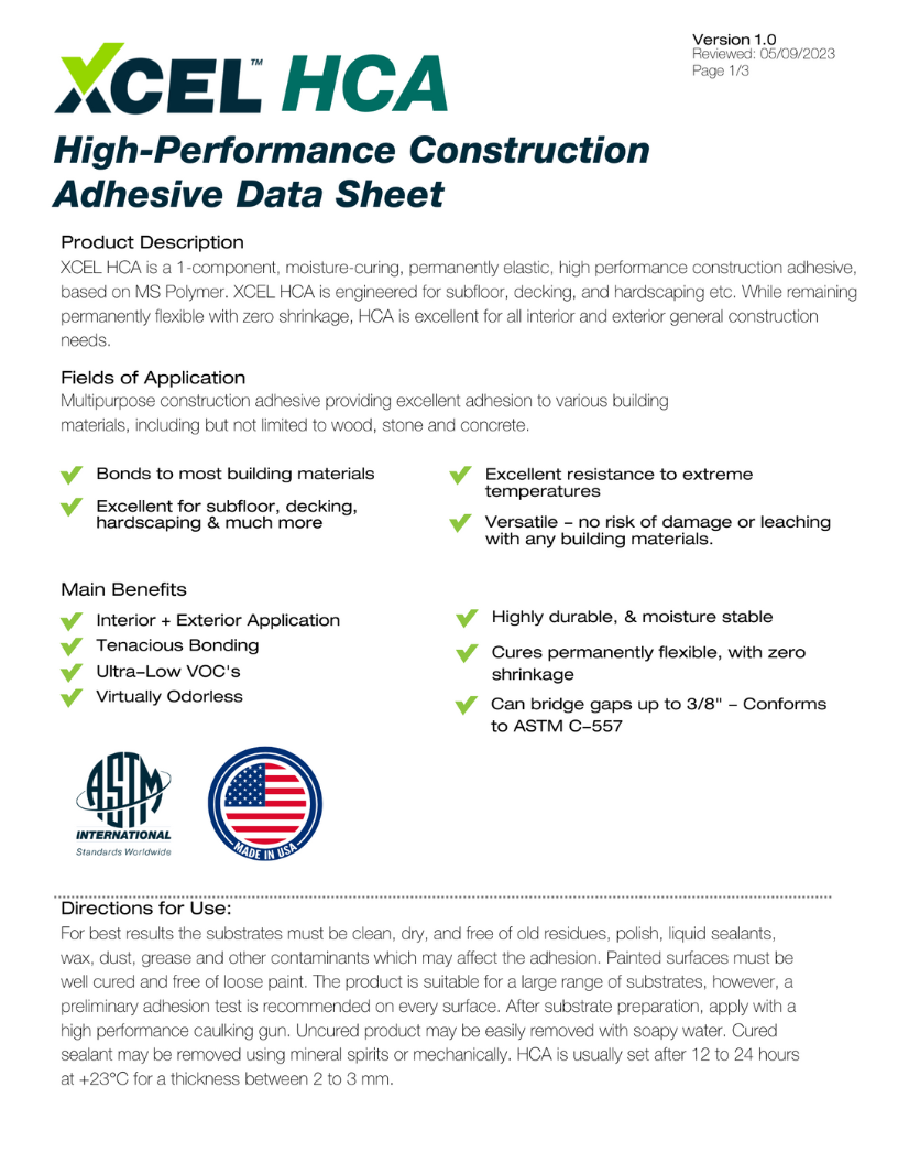 XCEL HCA is engineered with low to medium viscosity and is to be used as an all-weather adhesive for projects involving subfloor assembly and standard wood deck construction, or general construction. It may be used on all grade levels: concrete, cementitious underlayment, APA-grade underlayment plywood, and existing resilient flooring, metal and common flooring and decking materials.